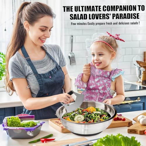 🍀【Non-slip Silicone Bottom】The salad cutter bowl’s non-slip silicone setting on the bottom is perfect for gripping and staying in place, preventing it from sliding on the countertops while mixing and protecting the table from high temperatures. Moreover, the silicone base is more wear-resistant, so you don’t need to worry about the wear and tear of the stainless steel bowl bottom due to long-term use.